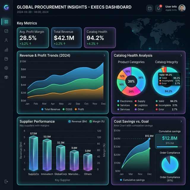 Executive dashboards showing delivery lifecycle, market arbitrage, and overall catalog health.